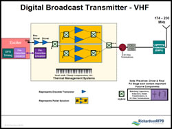 Also known as Band III, the VHF frequency range of 174-230 MHz is allocated to TV and Radio broadcasters in North American and Europe. The RF Amplifier provides the brute strength of the VHF Transmitter. Richardson RFPD supports the critical components of the Amplifier; including: RF power transistors, RF Power Amplifier Linearizer IC’s, hybrid couplers, pallet amplifiers, GPS receiver modules (timing), RF terminations, RF coaxial connectors, and thermal management systems (including heat sinks, clamp compression systems, and liquid-cooled chill plates).
